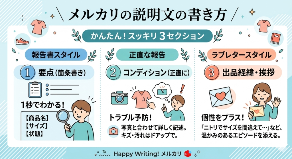 このバランスを意識するだけで、あなたの説明文は、ただの「商品の紹介」から「信頼の証」へと変わります。